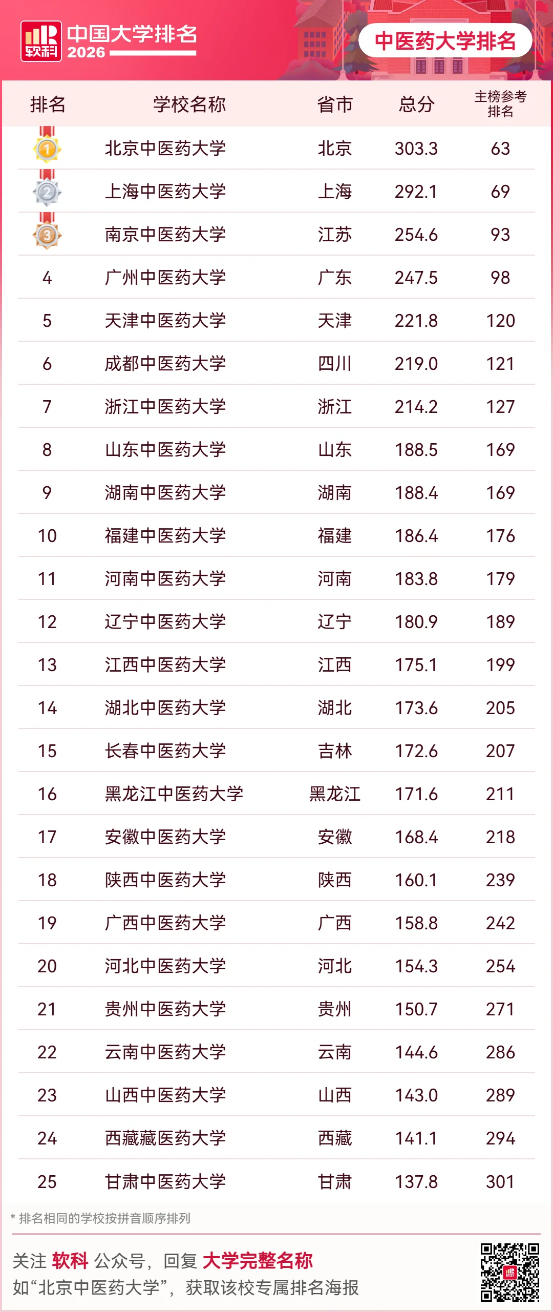 2026软科中国中医药大学排名的上榜高校有25所,北京中医药大学、上海中医药大学、南京中医药大学位列前三。