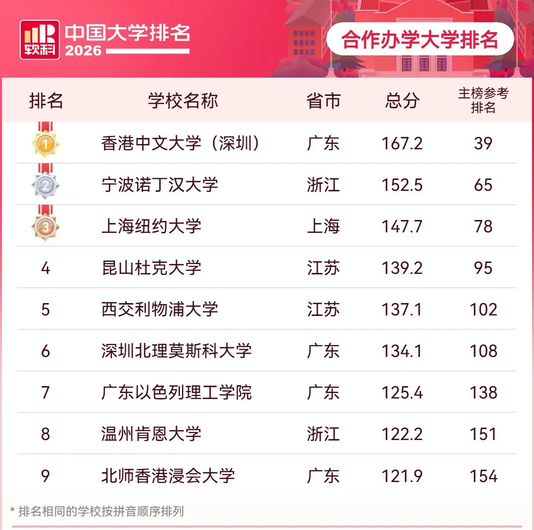 与去年相比,2026软科中国合作办学大学排名的院校新增1所(广东以色列理工学院),共9所。