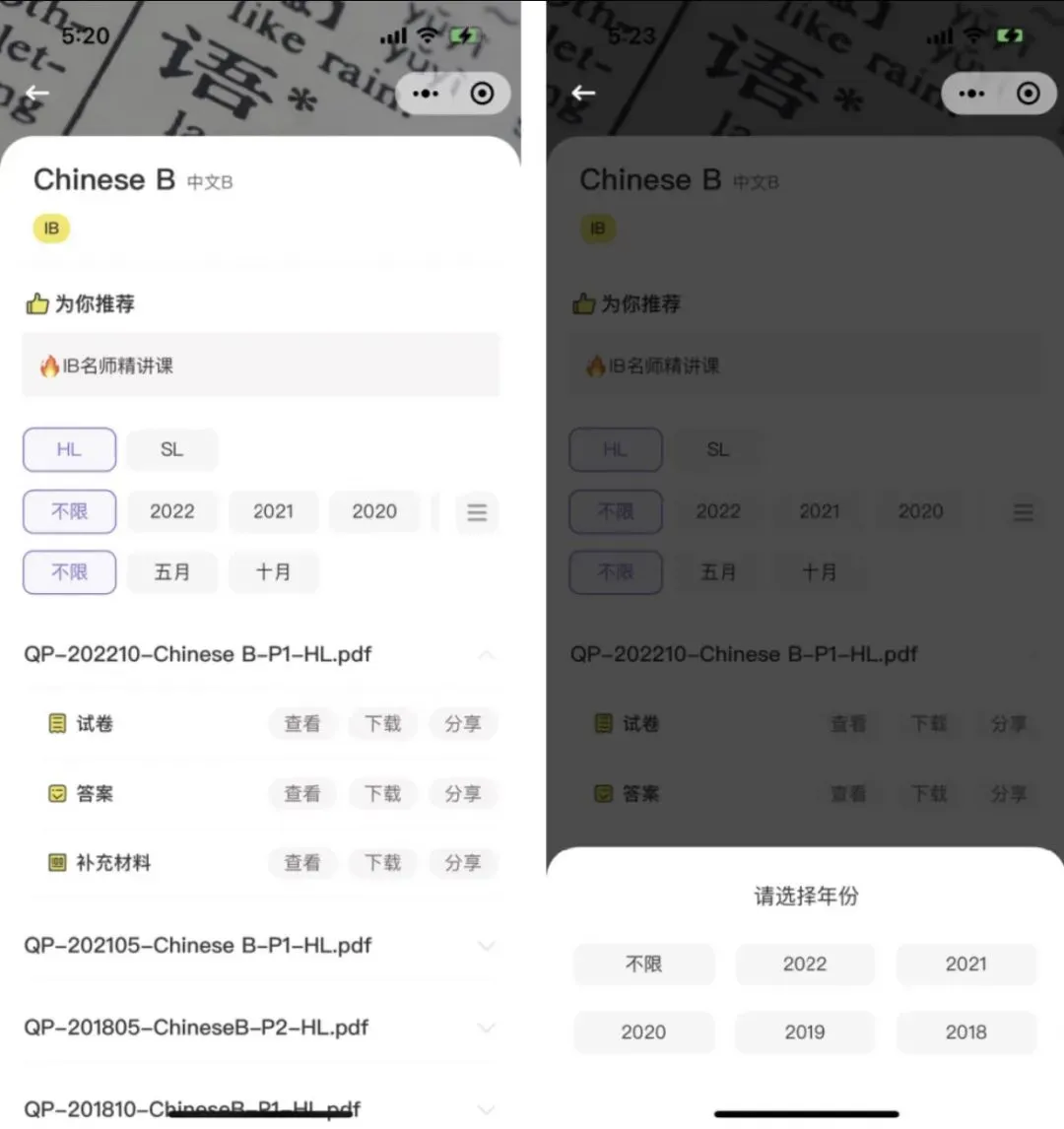【IB题库大全】小程序涵盖了(SL/HL)两类不同难度的历年考试科目及题库,囊括了12个热门科目近20年真题和答案,随时免费下载,再也不用辛苦找资料啦!