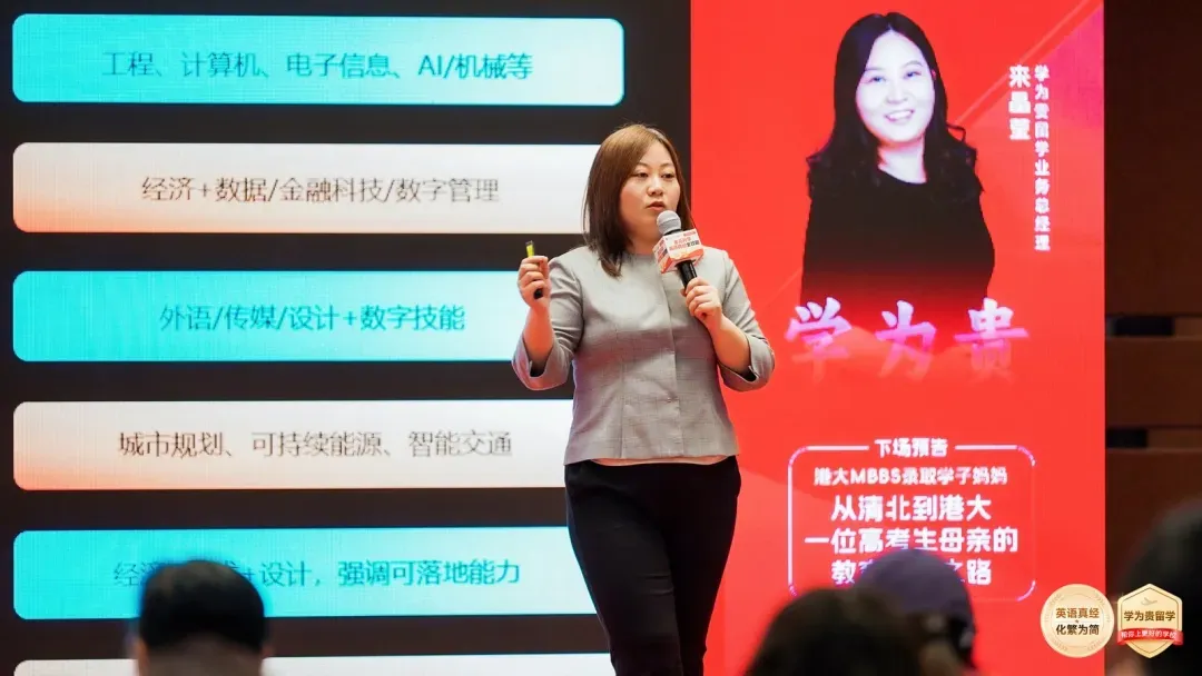 另一位手握7枚名校Offer、最终放弃北大选择港大的学员妈妈,登台讲述了在学为贵资深规划导师的帮助下,为孩子量身打造“高考+国际申请”双轨升学路径,一路陪伴孩子突破自我、实现名校梦想的全过程。