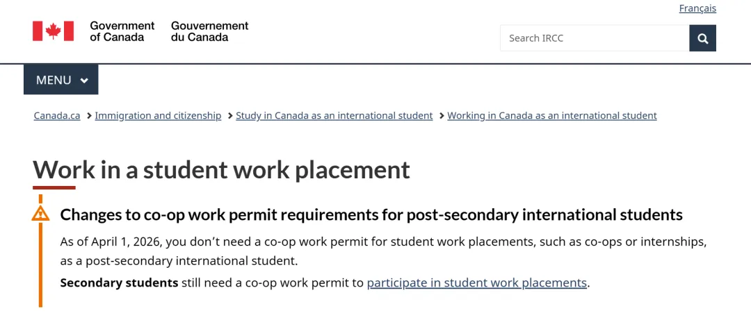 自2026年4月1日起,符合条件的高等教育国际学生(大专、本科、硕士、博士阶段)参与课程必修的实习、合作项目(Co-op)、实习(Internship)或实践课程(Practicum)时,无需单独申请Co-op工签,仅凭有效学习许可(Study Permit)即可完成实习。
